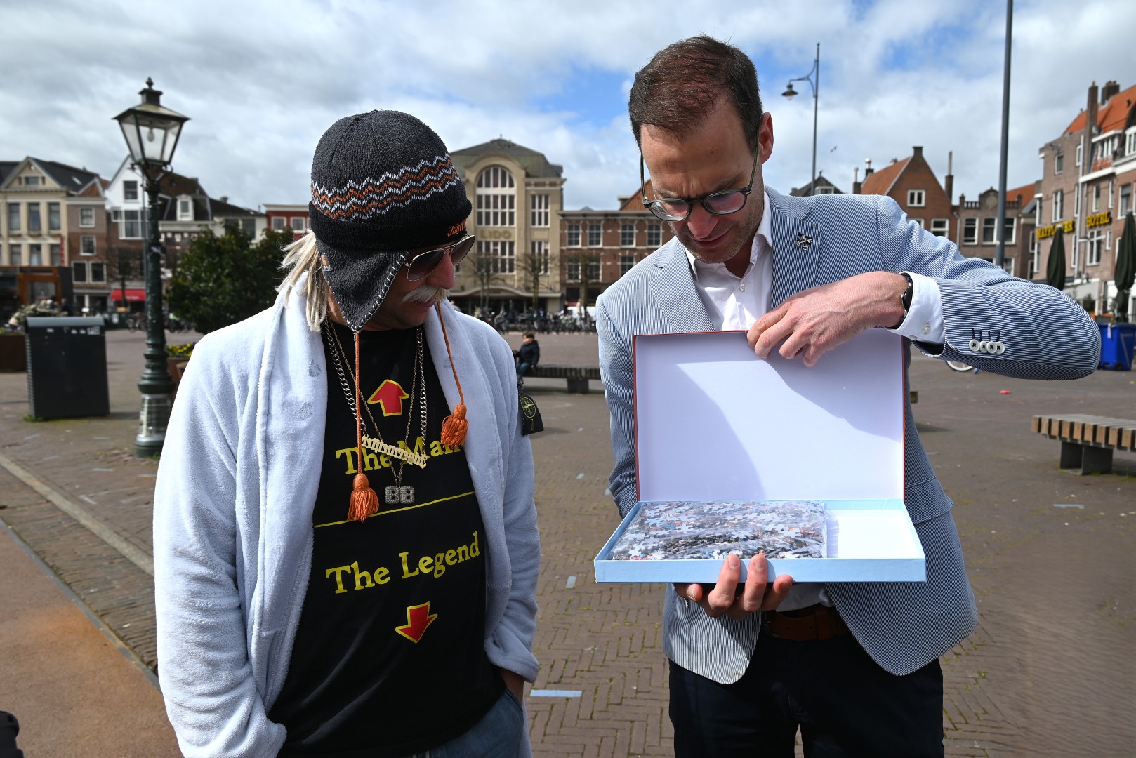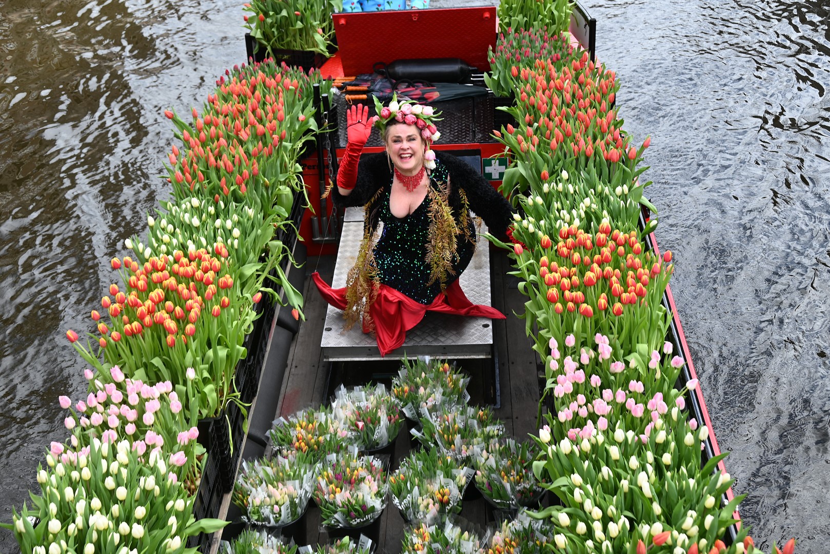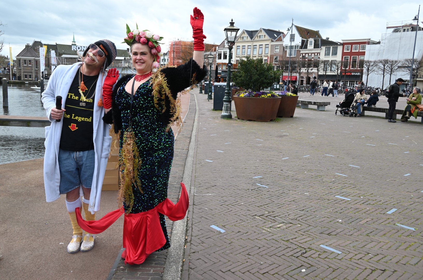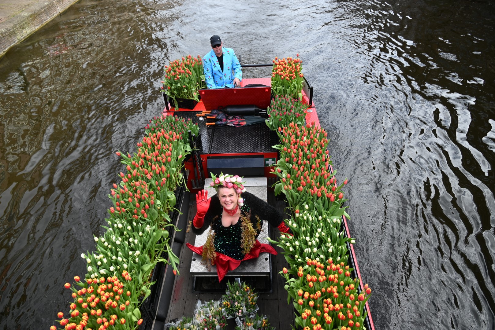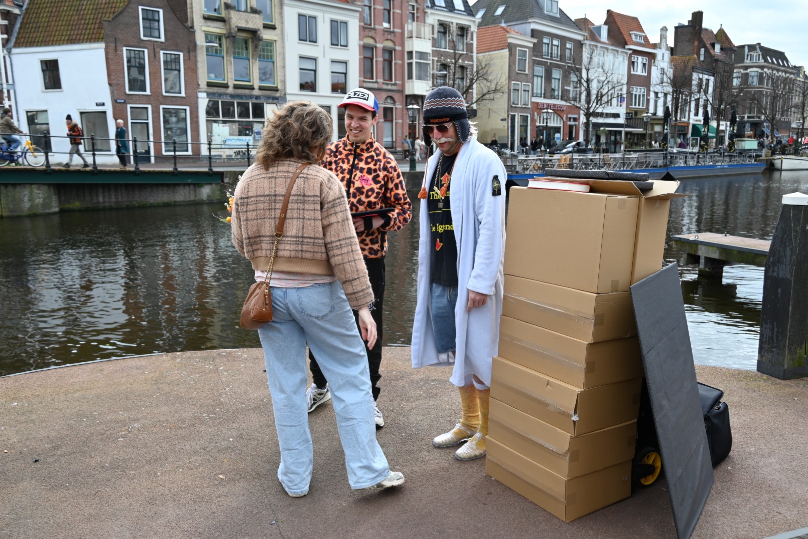 De Tulpenboot legde aan bij de Beestenmarkt, waar Burgemeester Peter Heijkoop de Veenmeermin welkom heette en niet alleen het eerste bosje tulpen in ontvangst nam, maar ook het eerste exemplaar van de puzzel ‘Leidse Tulpendag’. Uitgegeven door uitgeverij Puzzelstreken. Op de puzzel staan diverse bekende Leidenaren zoals; Rembrandt, Armin van Buuren, Peter Labrujere en Barry Badpak. Nadat Barry Badpak de puzzel had onthuld, voer de boot verder het centrum in en deelden hostessen de bosjes tulpen uit.
