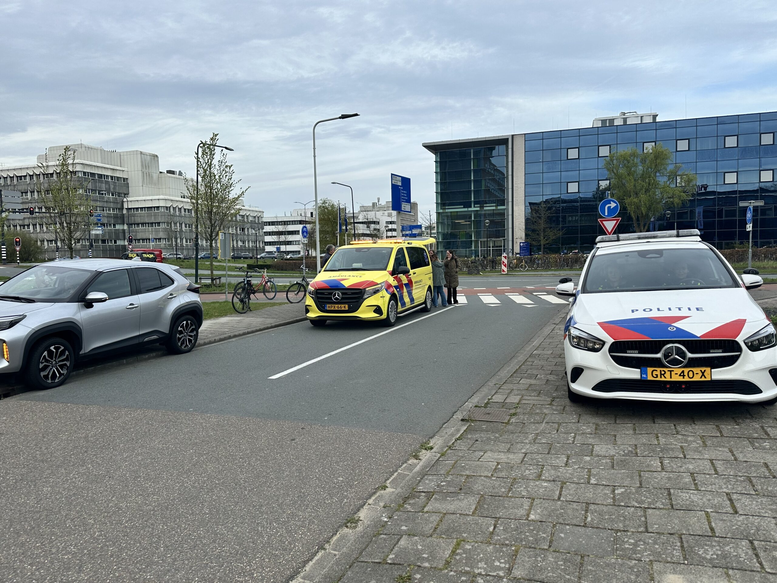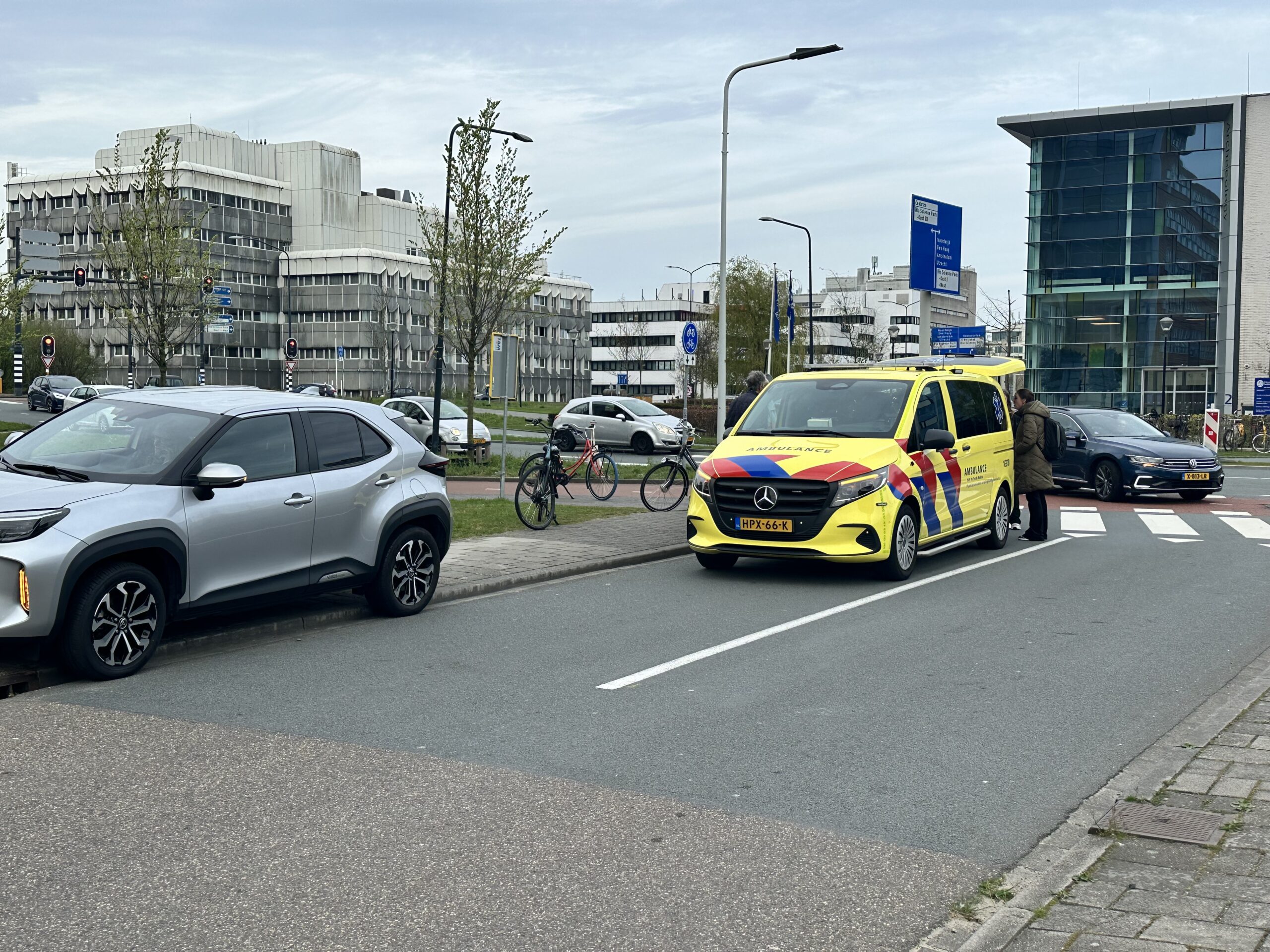 Een vrouw op de fiets is maandagochtend rond 9.00 uur door een auto aangereden op de kruising van de Einsteinweg en Archimedesweg in Leiden.