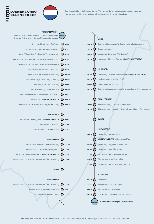 De Bollenstreek maakt zich op voor de mooiste file van het jaar. Met een route van maar liefst 42 kilometer lang rijden praalwagens, versierd met miljoenen geurige hyacinten en kleurrijke voorjaarsbloemen ook dit jaar weer van Noordwijk naar Haarlem.