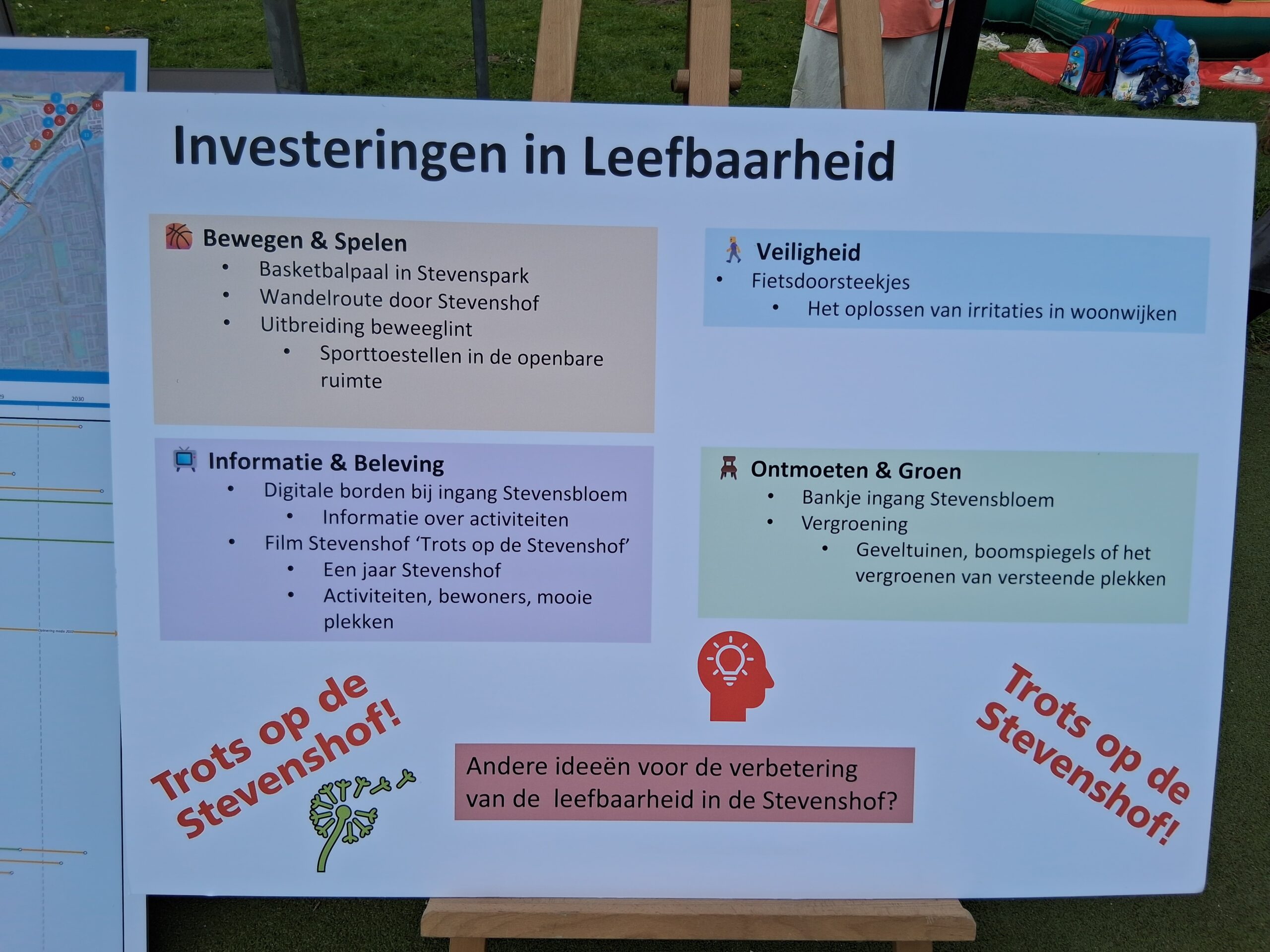 Een groot project wat gepresenteerd werd, is het Panoramapark. Dat is een plan waarbij alle parken aan de rand van de stad aan elkaar gekoppeld worden als een soort Singelpark XL. Dat park gaat ook door de Stevenshof lopen, en daarom wordt er ook om input uit die buurt gevraagd.