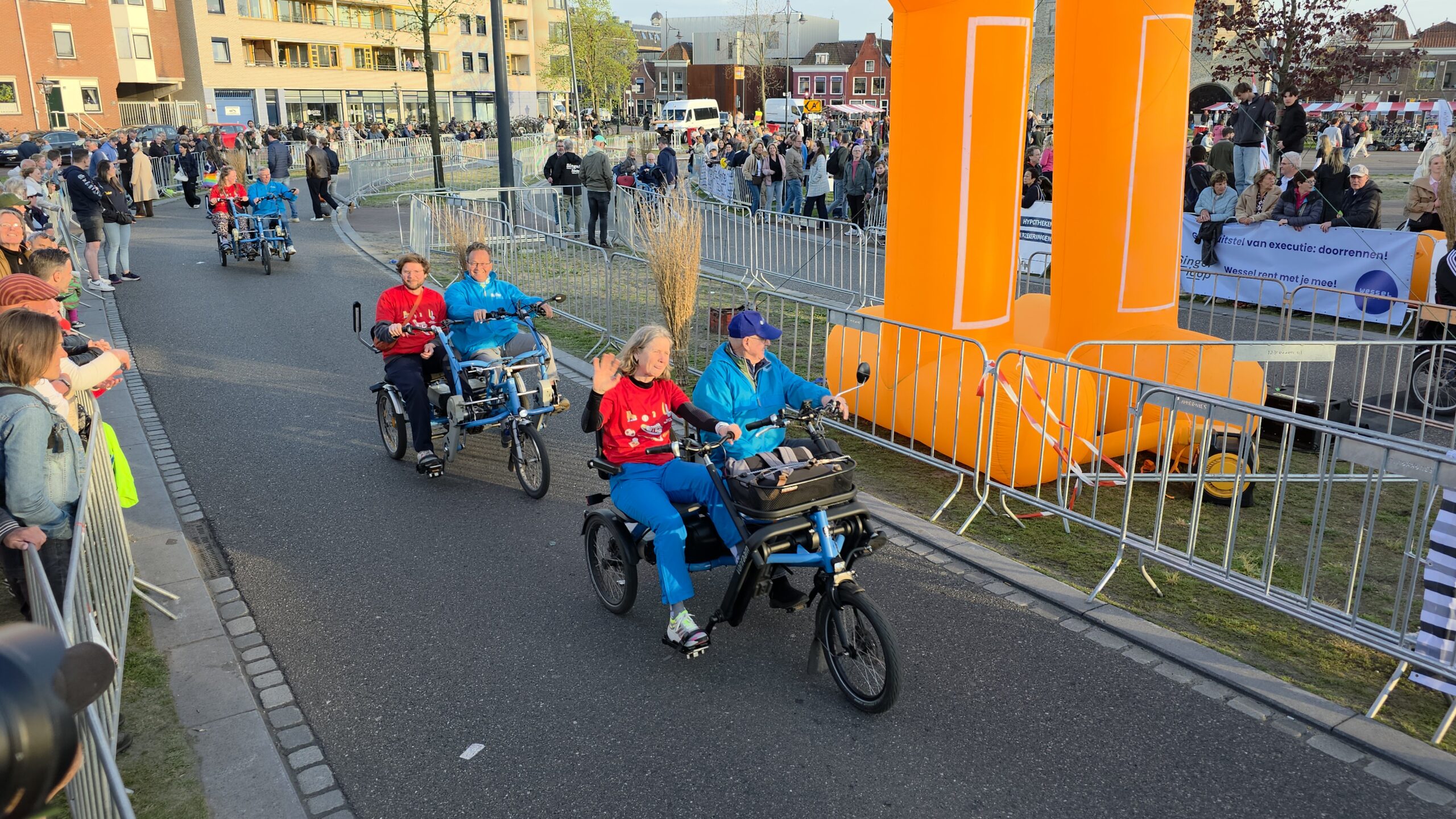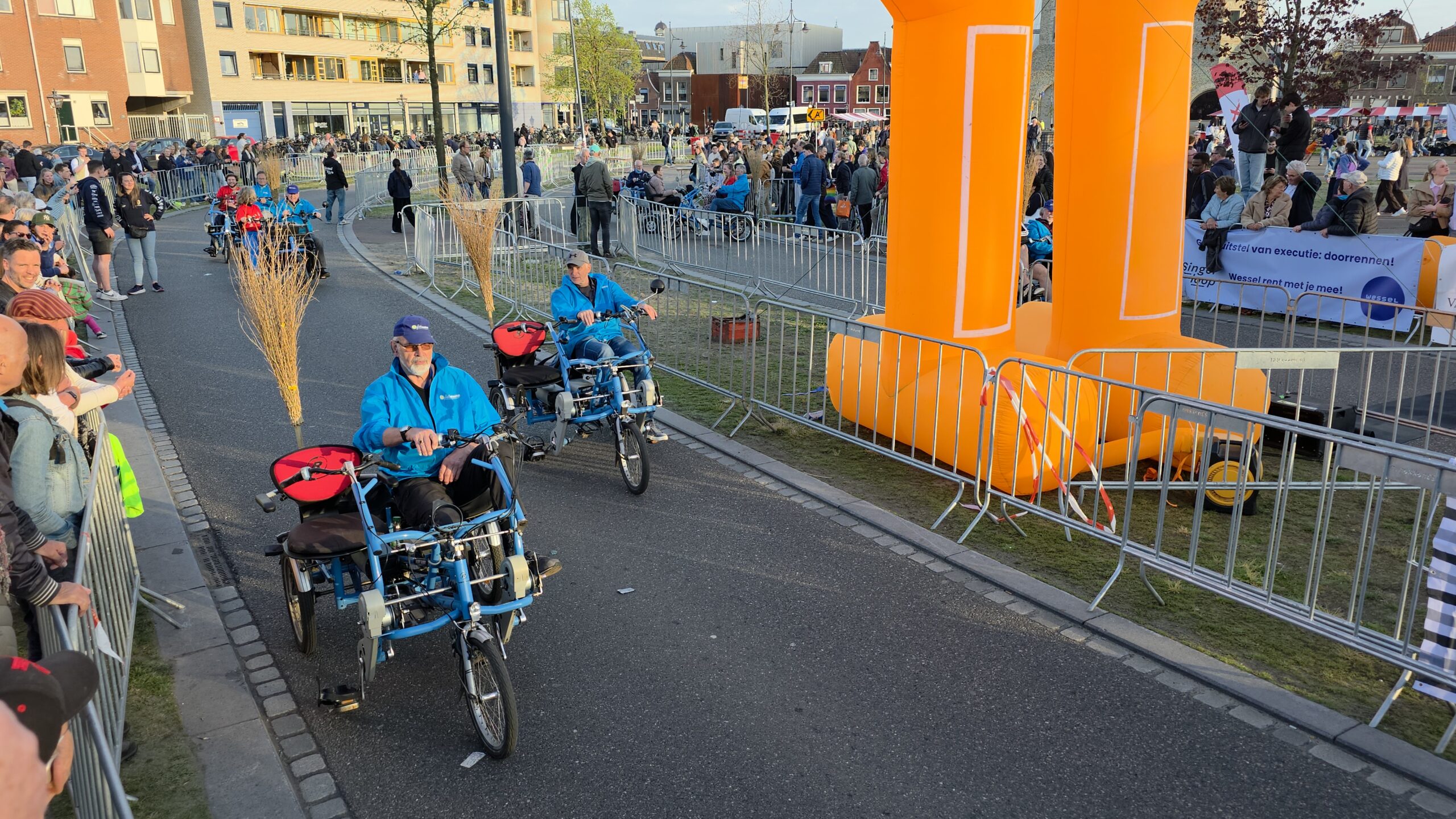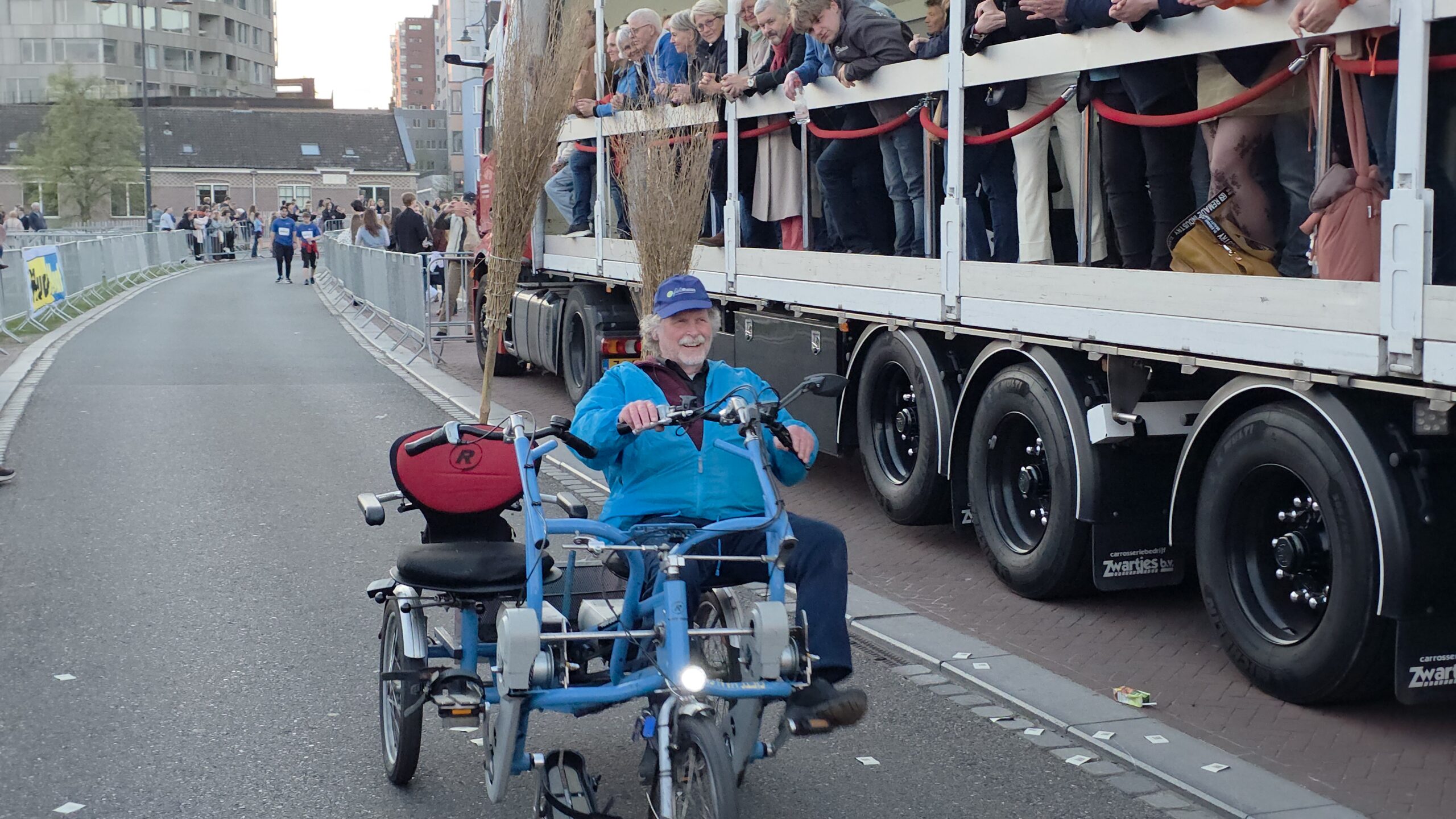 Mochten er kinderen zijn voor wie de tocht toch net een beetje te lang is, dan is daar altijd nog de ‘bezemwagen’ van Fietsmaatjes. Peter en juf Jorinde bemensten zo’n fiets. Peter: “Er zijn heel vaak jonge kinderen die het niet vol kunnen houden en die gaan dan mee.” Jorinde: “Als ze echt niet meer kunnen rennen dan mogen ze een stukje mee. Als ze al een tijdje achteraan aan het wandelen zijn dan pikken we ze op. Dan mogen ze op schoot.” Peter: “Ik doe dit al een paar jaar. Je krijgt een kind in de fiets en na een paar honderd meter kunnen ze dan wel weer. En dan gaan ze vrolijk weer vijfhonderd meter rennen.”