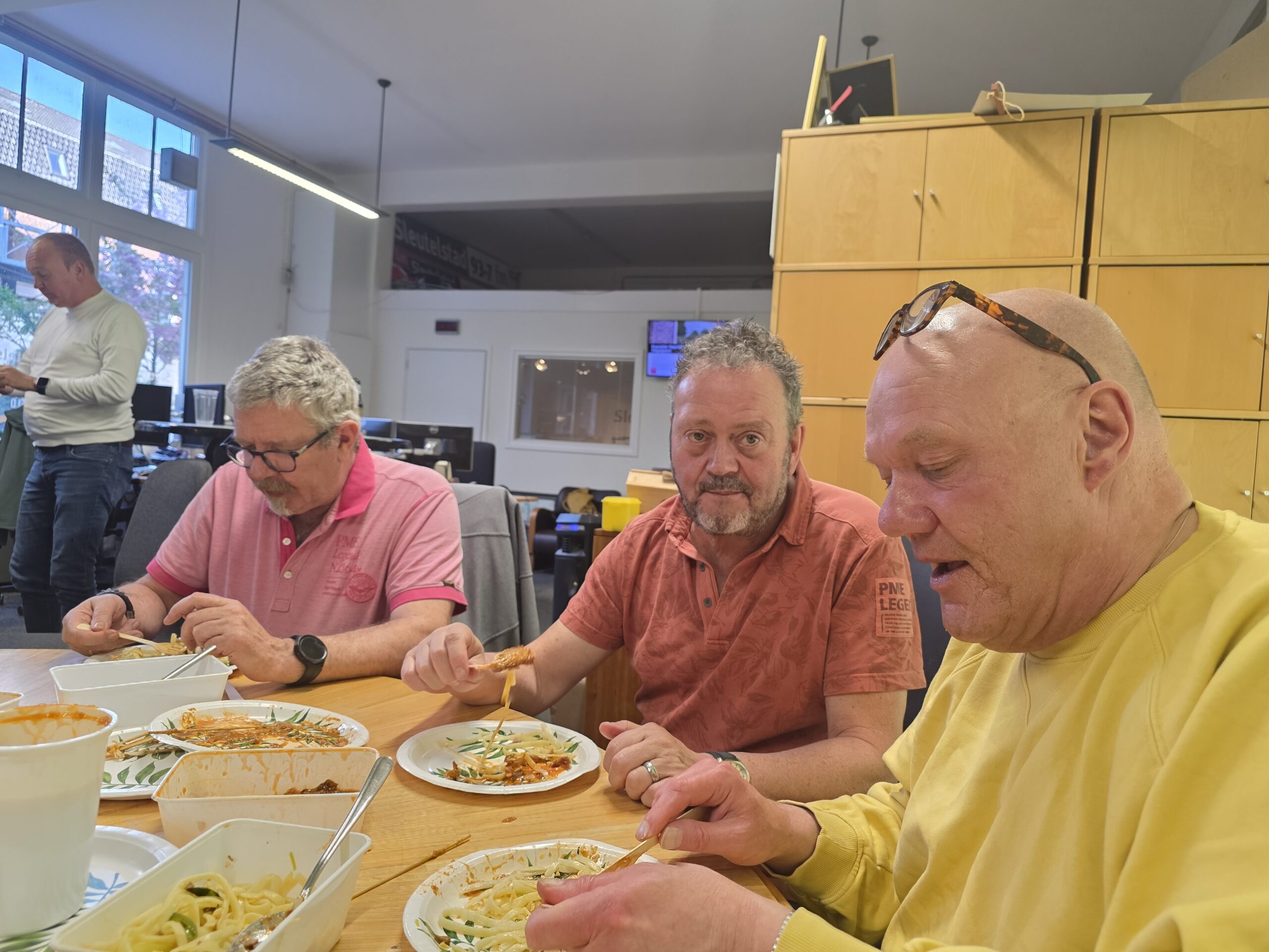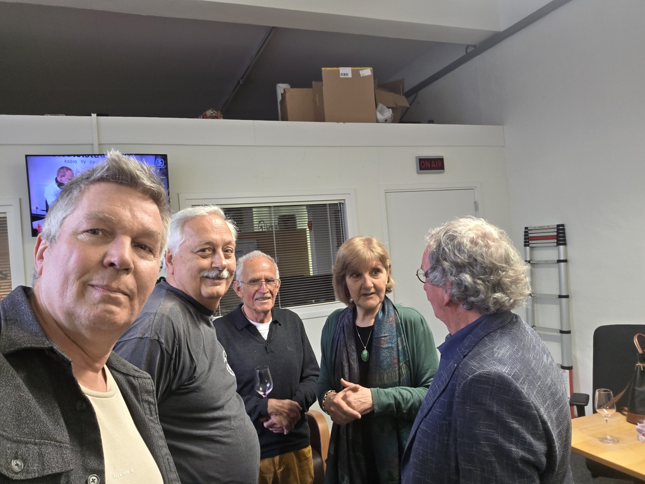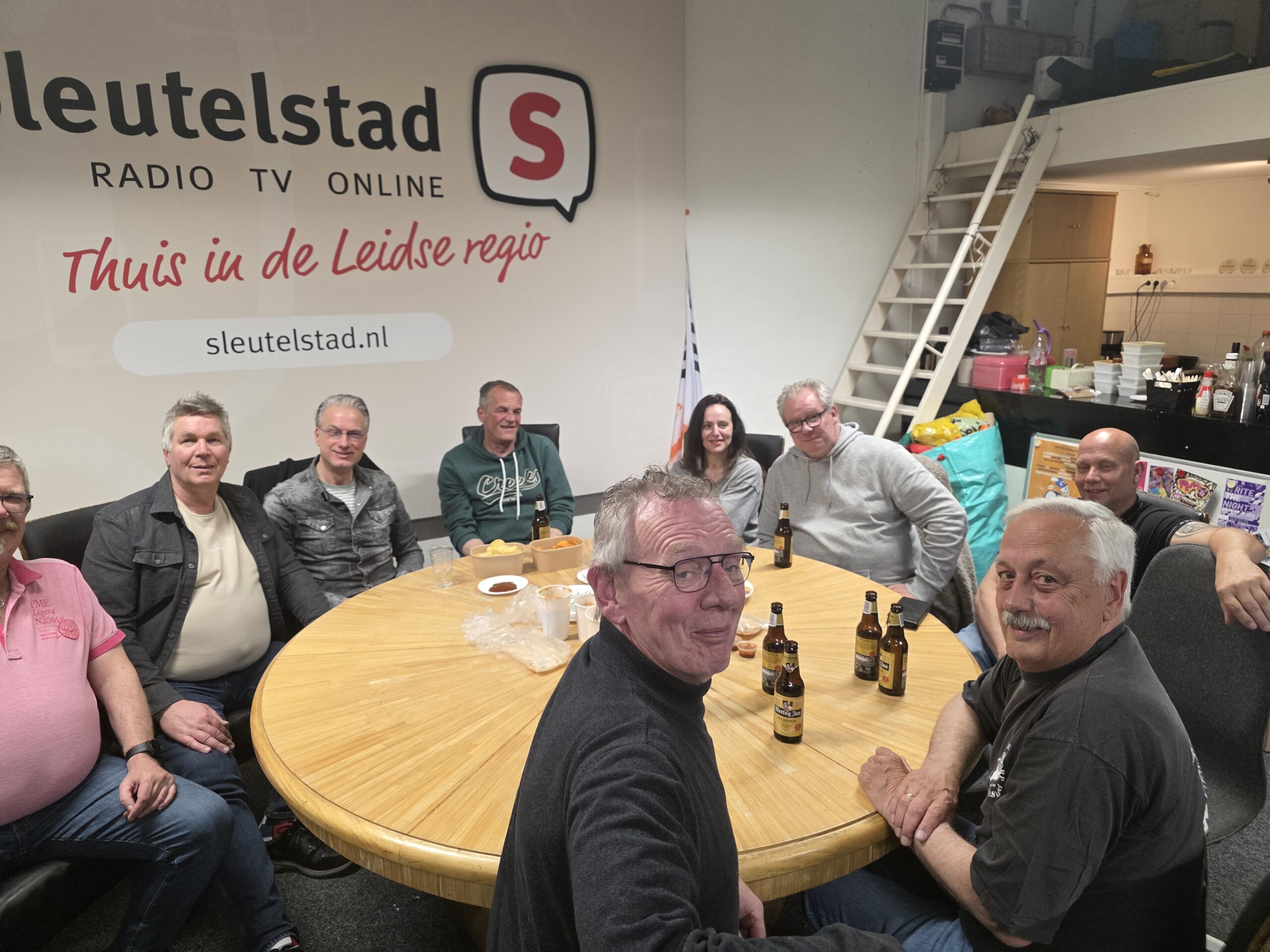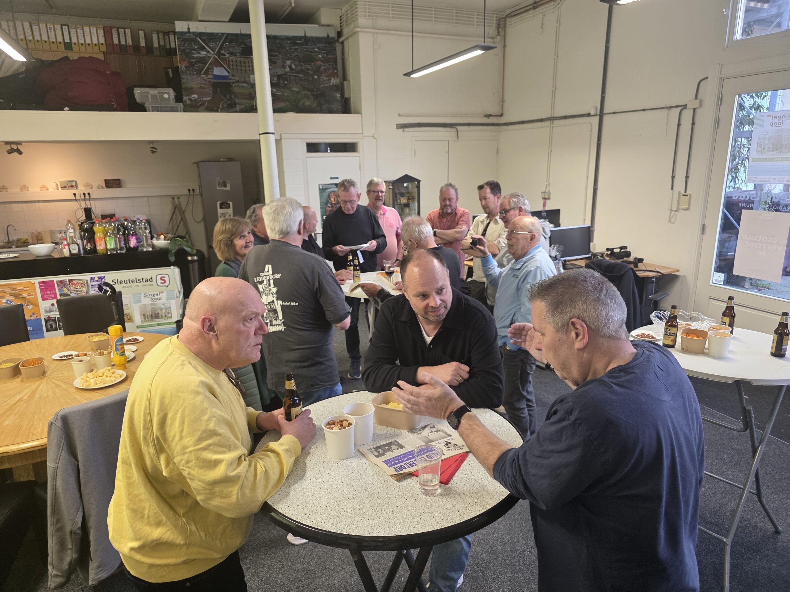 De redactie- en studioruimtes van Sleutelstad werden zaterdag aan het einde van de middag ‘bezet’ door radiomakers uit Leiderdorp. Onlangs ontstond het idee bij een aantal vrijwilligers van de voormalige lokale omroep Radio Leiderdorp om voor het eerst een reünie te houden. Sleutelstad stelde daarvoor graag ruimte beschikbaar.