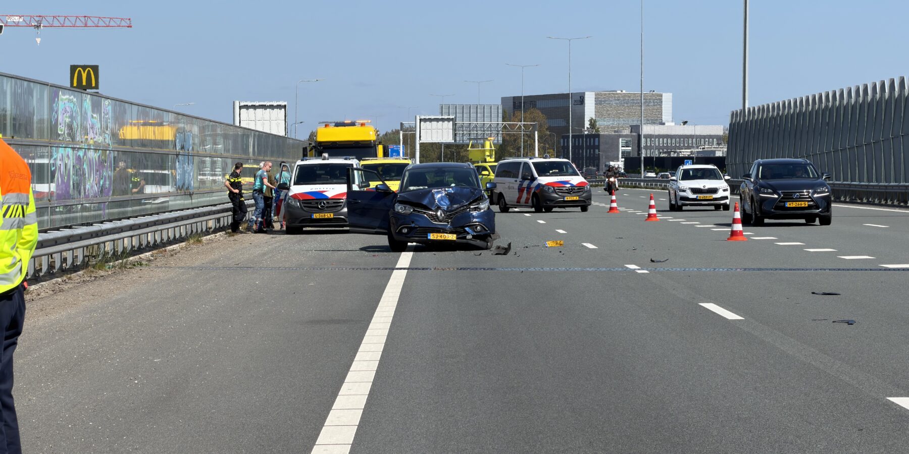 Het voorste voertuig is door een politietakel geborgen in verband met verder technisch onderzoek. De oprit van de A44 bij Leiden werd door Rijkswaterstaat enige tijd afgesloten.