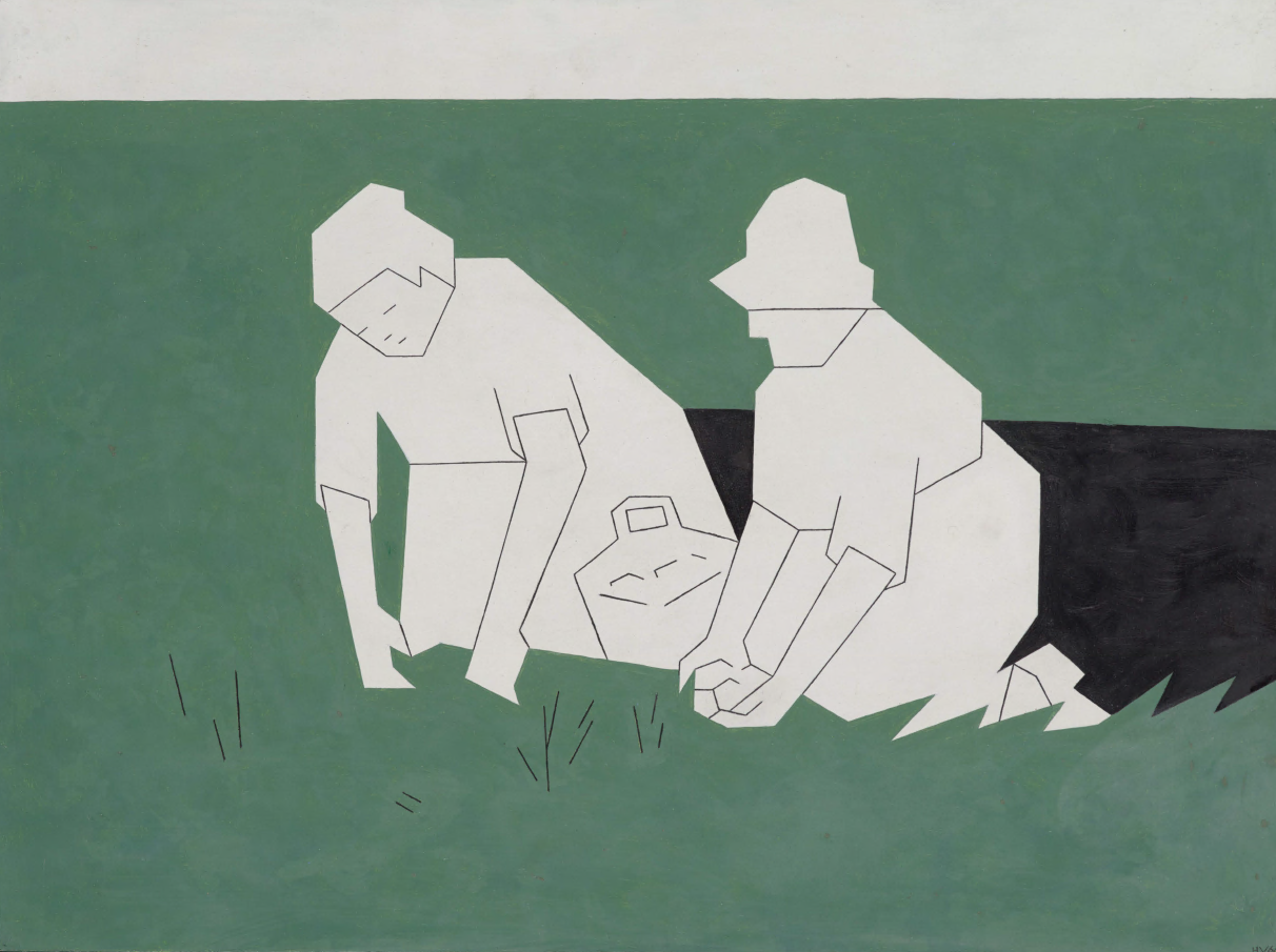 Links: Tjerk Bottema, Picknick in het gras, ca. 1920-1940. Collectie Museum De Lakenhal. Rechts: Hendrik Valk, Aardappelrooien, 1966. Collectie Museum De Lakenhal.