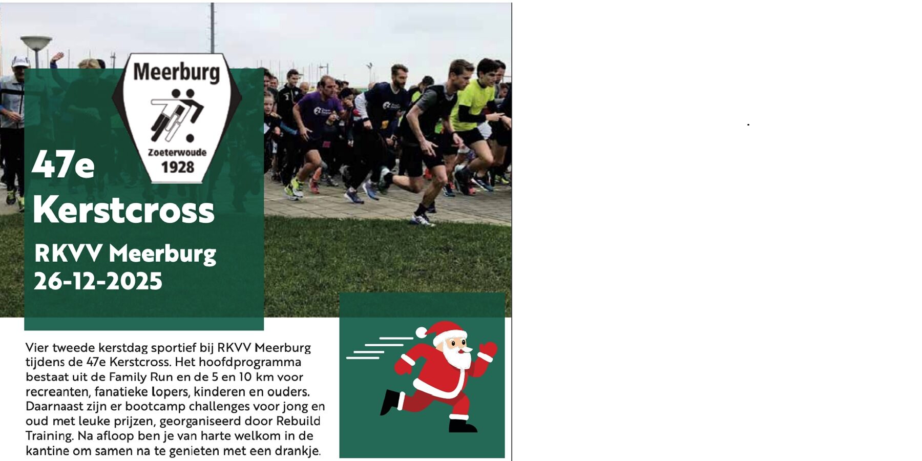 Voor iedereen die Tweede Kerstdag graag actief doorbrengt, organiseert voetbalvereniging RKVV Meerburg dit jaar alweer de 47e editie van de Kerstcross. Een sportieve traditie voor jong en oud, met een veelzijdig programma voor zowel recreanten als fanatieke hardlopers.