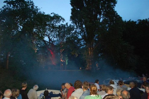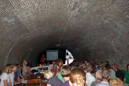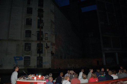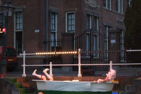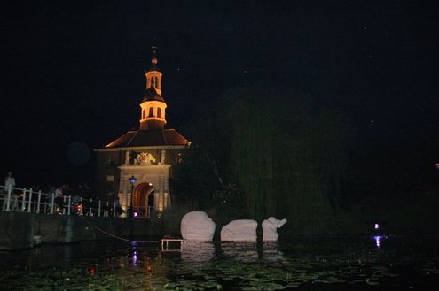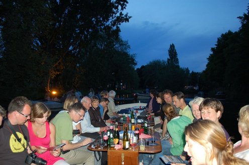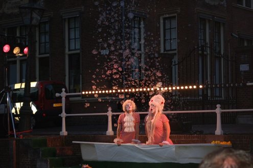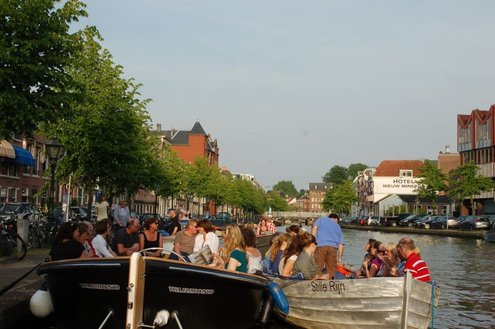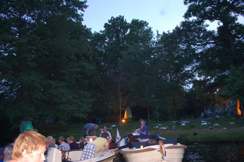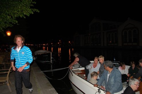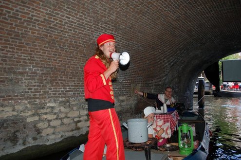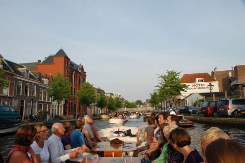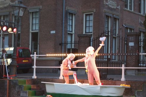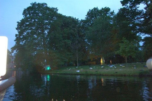 Terwijl de zomerlucht boven de Sleutelstad langzaam overging van de dag naar de nacht, stapten zo’n 350 mensen in diverse boten voor een huiveringwekkende rondvaart langs intrigerende plekken. Op een aantal bijzondere Leidse locaties, zoals Begraafplaats Groenesteeg, de Meelfabriek, Zoeterwoudsesingel, Rapenburg en de onder de Koornbeursbrug, voerden theatermakers korte voorstellingen en performances uit, onder de titel ‘Schemerstad’. Om de angst wat te temperen was er volop te drinken aan boord en werd de stemming steeds vrolijker. Naast de georganiseerde tocht, voeren veel mensen mee met eigen, kleine bootjes of keken én luisterden, waar mogelijk, vanaf de kant naar de indrukwekkende schouwspelen. Het project werd uitgevoerd door: Jan Joost Aten, PS|Theater, Theaterwerkplaats Har(d)t, Fields of Wonder, Kunst Uitschot Team en Jurjen Alkema/Jos Agasi/Andrea Dröes. Vanwege het grote succes is het waarschijnlijk, dat er volgend jaar weer een ‘Leiden Schemerstad‘ plaats zal vinden. Emile van Aelst was aan boord en maakte een fotoverslag.
