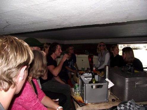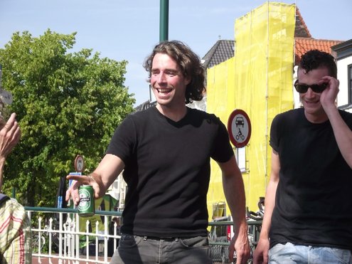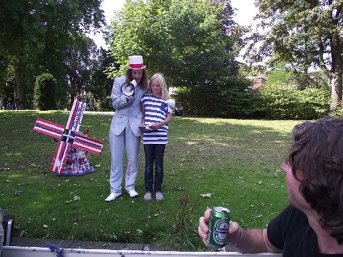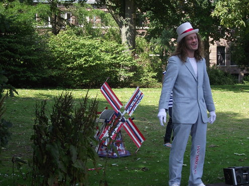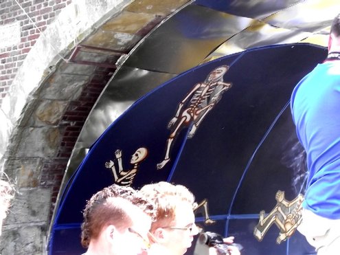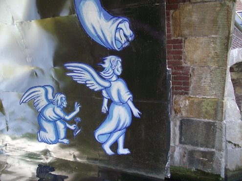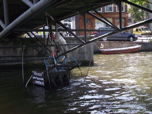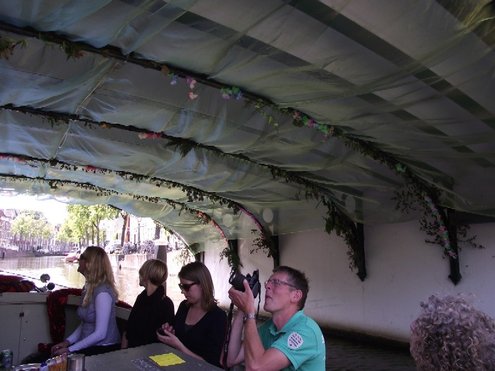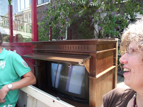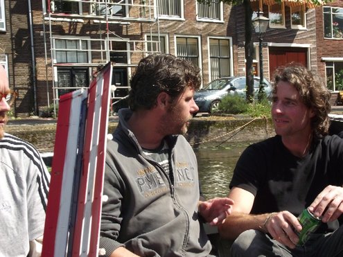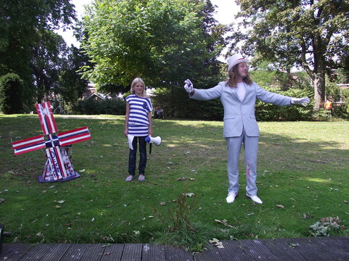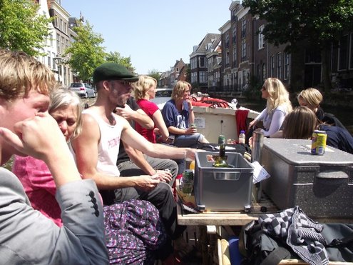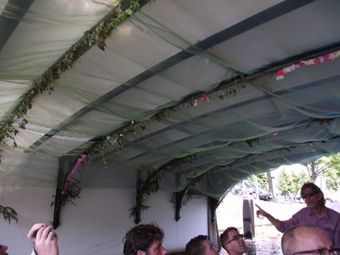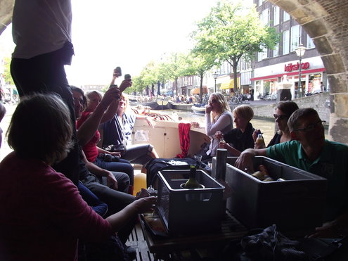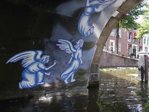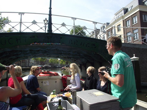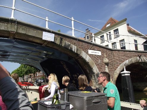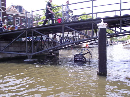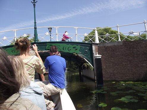 Vanmiddag vond de speelse aftrap plaats van het kunstproject ‘Schemerbruggen’, dat tot en met eind augustus te zien is. Alleen onder de bruggen schemerde het, want verder was het een zonnig dagje voor een kunstzinnige boottocht door de Leidse wateren. Diverse bruggen zijn voorzien van verrassende en speelse kunst, die vooral vanaf het water goed te bewonderen is. Geïnspireerd door het provinciale themajaar “Leve de molens!” vertellen deze Leidse kunstenaars, waaronder Merijn Tinga, Paul Bouter, Julia van Adrichem, Ans Volkers, Irene Cécile en Bastian de Wit doormiddel van hun kunst, over wind, stroming, molens, water, en de cirkel van goed en kwaad. Schemerbruggen is een initiatief van CTV Zuid-Holland en wordt uitgevoerd door ProKwadraat en Jennig. Informatie is vanaf vandaag verkrijgbaar bij onder meer het Visitors Centre aan de Stationsweg. (Foto’s: Jacqueline Borg)